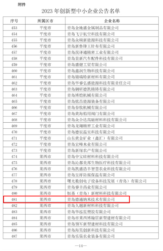 根據(jù)工信部《優(yōu)質(zhì)中小企業(yè)梯度培育管理暫行辦法》、《青島市優(yōu)質(zhì)中小企業(yè)梯度培育管理實(shí)施細(xì)則》和《關(guān)于組織開展2023年創(chuàng)新型中小企業(yè)評(píng)價(jià)和專精特新中小企業(yè)認(rèn)定工作的通知》要求,經(jīng)企業(yè)申報(bào)、區(qū)市推薦、第三方機(jī)構(gòu)審核、社會(huì)公示等程序,現(xiàn)公告青島德通納米技術(shù)有限公司等529家企業(yè)(名單見附件)為2023年創(chuàng)新型中小企業(yè),有效期三年,現(xiàn)予以公告。